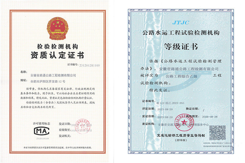 安徽省路通公路工程檢測有限公司成立于2003年7月?,F(xiàn)擁有公路工程綜合乙級檢測資質(zhì)、排水管道檢測及評估作業(yè)能力III級作業(yè)證書,并通過了檢驗檢測機構(gòu)資質(zhì)認定。2021年12月16日,獲批“高新技術(shù)企業(yè)”。各專業(yè)試驗檢測人員配備齊全,具備開展集料、鋼材、土工、瀝青及瀝青混合料、水泥及水泥混凝土、砂漿、無機結(jié)合料、水、外加劑、磚以及路基路面、混凝土結(jié)構(gòu)物、基坑地基與基樁、橋梁結(jié)構(gòu)、交安設(shè)施、公路與橋梁技術(shù)狀況和城鎮(zhèn)排水管道檢測等多項試驗檢測的能力。