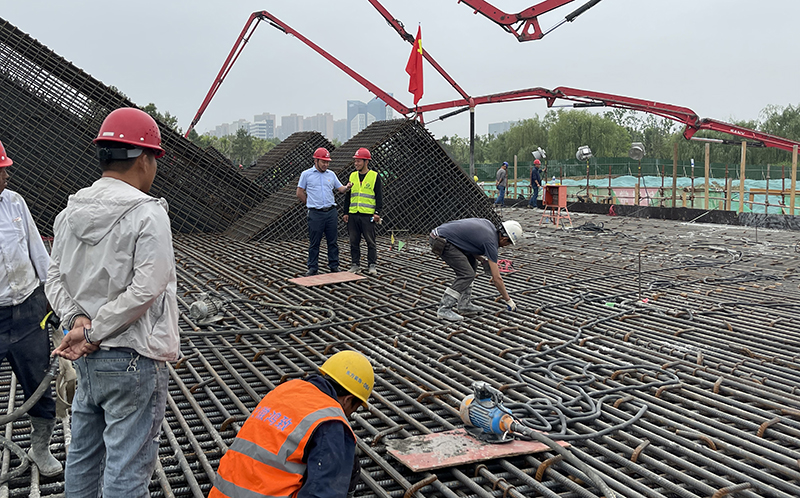 整個澆筑任務于5月11日15點開盤,4198m3砼不間斷澆筑,項目部經營層帶班24小時輪班駐守。現場燈火通明、有序指揮、安全保通、送料簽單、車輛泵送、搗棒振搗、冷卻循環、測溫記錄、四周巡檢及后勤保障,各項工作有條不絮、如火如荼地進行。