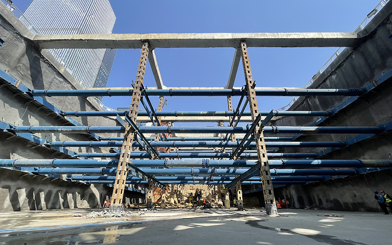 雙層段基坑深度17m,縱向長度32m,橫向長度33.8m。深基坑作業危險因素眾多,為保障基坑安全開挖,項目在開挖前進行多次模擬推演,預估風險源并不斷優化施工方案。開挖過程中遵循時空效應,采取“先撐后挖、水平分段、豎向分層”原則,做到“分層、分步、對稱、平衡、限時”五個要點,雙層下穿段土方量1.9萬m3,經過連續作業4月16日完成基坑開挖并通過五方責任主體單位基坑驗槽,4月19日完成墊層混凝土澆筑。