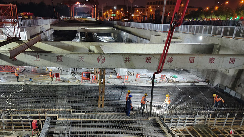近日,由安徽省交通建設股份有限公司承建的合肥新橋機場S1線土建施工總承包1標四里河路施工現場,伴隨最后一塊頂板的澆筑完成,標志著四里河路車站主體結構順利實現封頂。