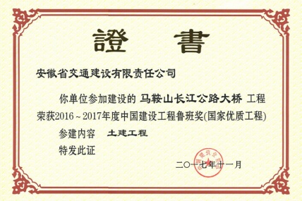 馬鞍山長江公路大橋工程榮獲“2016-2017年度第一批中國建設工程魯班獎”,“第15屆中國土木工程詹天佑獎”, 該項目由安徽省交通建設股份有限公司(以下簡稱安...