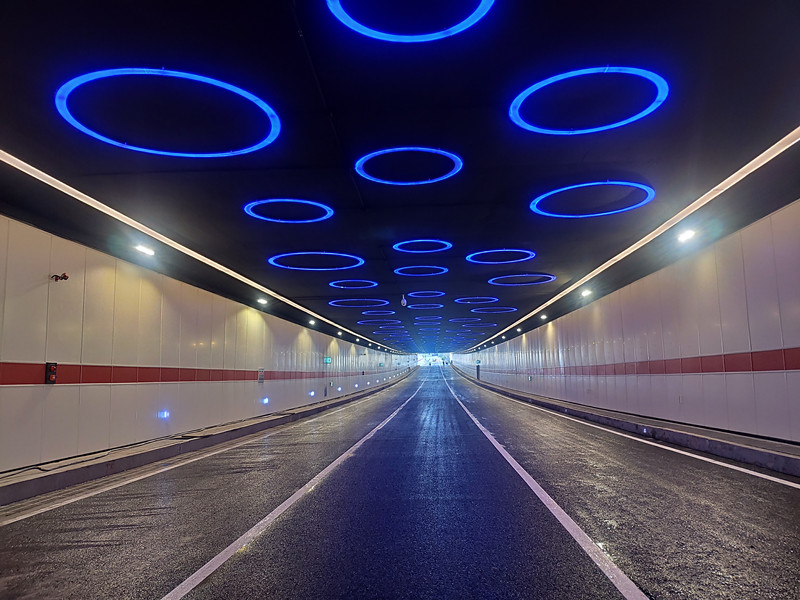 在隧道裝修方面,入口設置形如天鵝展翅遮光棚,改善進出隧道行車視線;隧道內白墻黑頂,紅色腰線伸向遠處,內頂鑲嵌圓形LED燈飾,如湖底映射的一個個藍色漣漪。